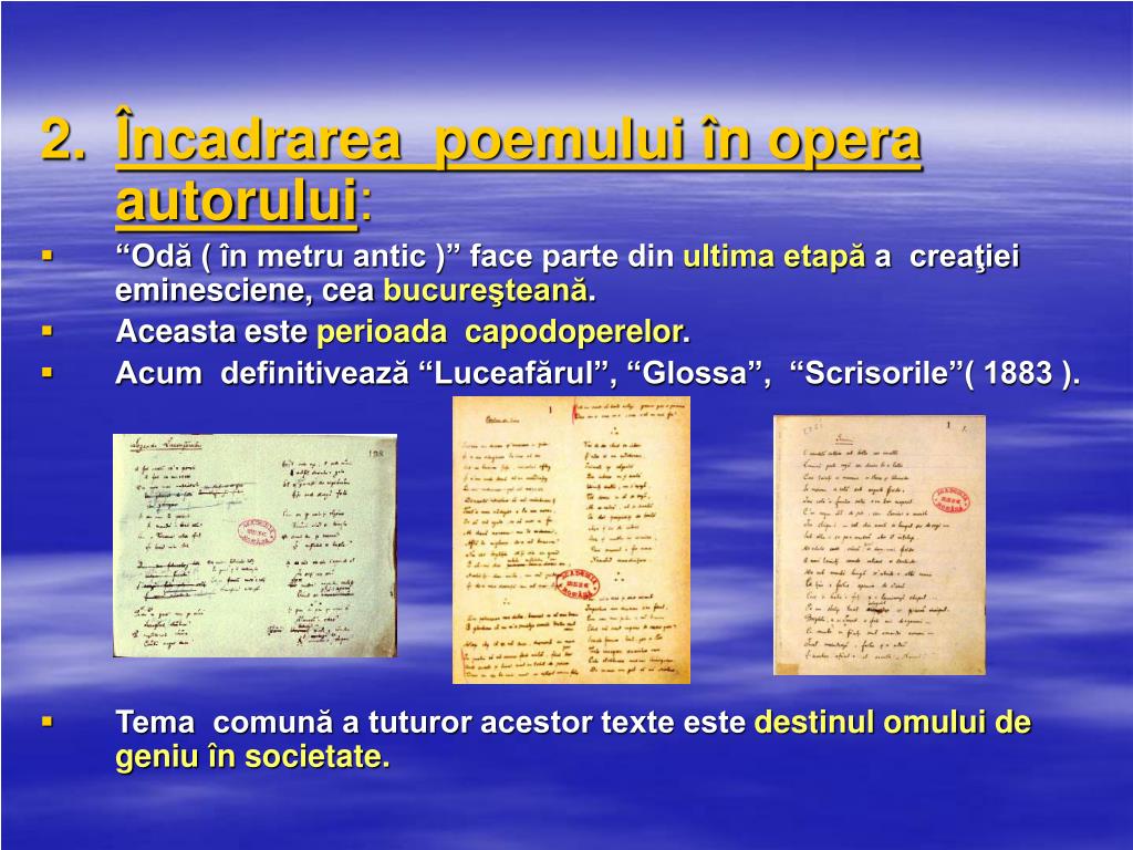 Încadrarea poemului în opera autorului: • “Odă ( în metru antic )” face parte din ultima etapă a creaţiei eminesciene, cea bucureşteană. • Aceasta este perioada capodoperelor. • Acum definitivează “Luceafărul”, “Glossa”, “Scrisorile”( 1883 ). • Tema comună a tuturor acestor texte este destinul omului de geniu în societate.