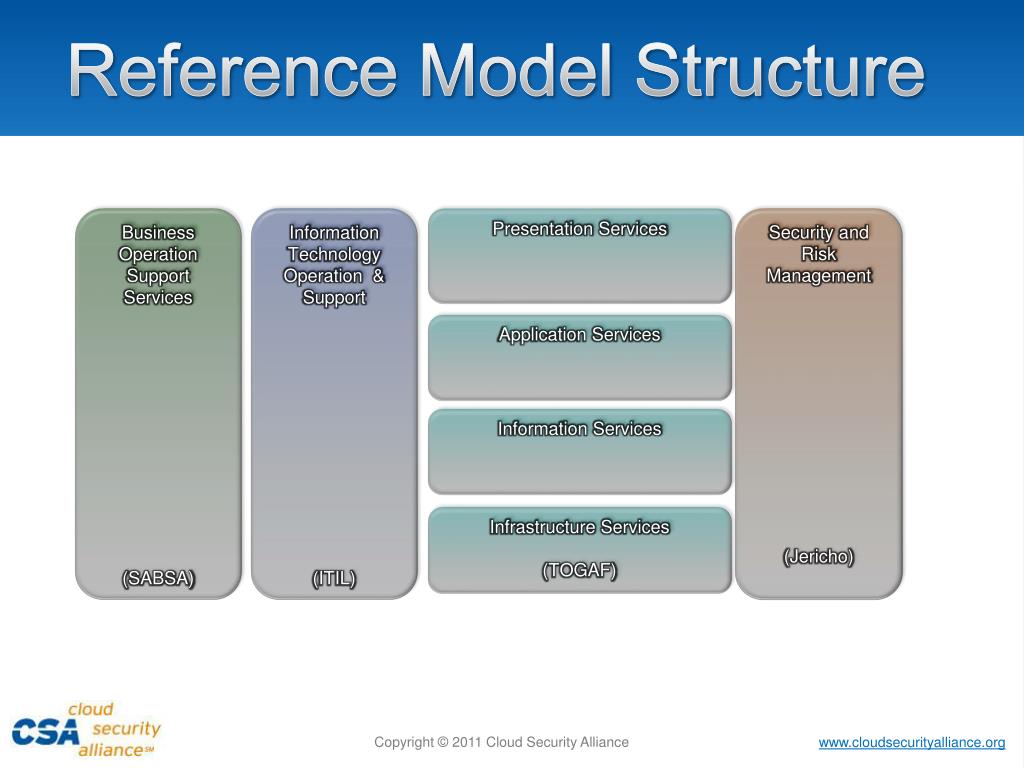 Reference Model Structure Presentation Services Security and Risk Management (Jericho) Business Operation Support Services (SABSA) Information Technology Operation & Support (ITIL) Application Services Information Services Infrastructure Services (TOGAF)