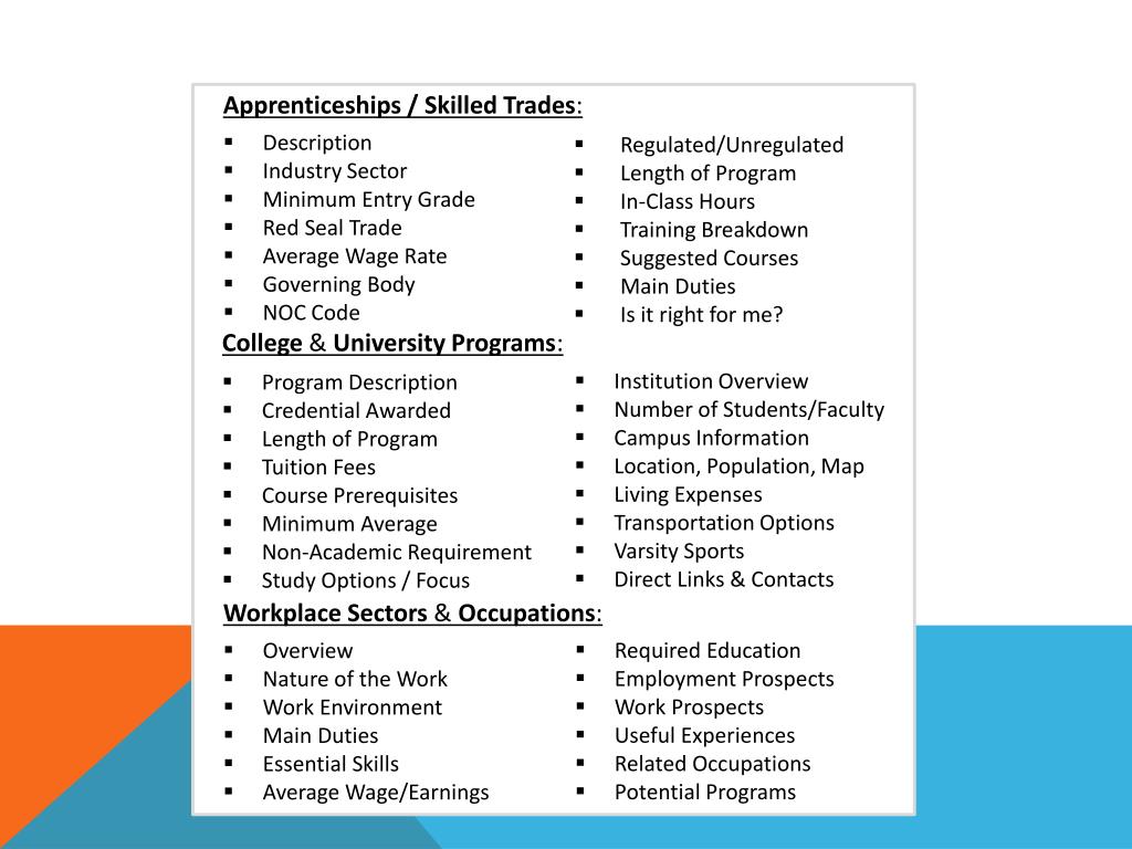 INFORMATION PROVIDED • College & University Programs: • Program Description • Credential Awarded • Length of Program • Tuition Fees • Course Prerequisites • Minimum Average • Non-Academic Requirement • Study Options / Focus • Institution Overview • Number of Students/Faculty • Campus Information • Location, Population, Map • Living Expenses • Transportation Options • Varsity Sports • Direct Links & Contacts • Apprenticeships / Skilled Trades: • Description • Industry Sector • Minimum Entry Grade • Red Seal Trade • Average Wage Rate • Governing Body • NOC Code • Regulated/Unregulated • Length of Program • In-Class Hours • Training Breakdown • Suggested Courses • Main Duties • Is it right for me? • Workplace Sectors & Occupations: • Overview • Nature of the Work • Work Environment • Main Duties • Essential Skills • Average Wage/Earnings • Required Education • Employment Prospects • Work Prospects • Useful Experiences • Related Occupations • Potential Programs