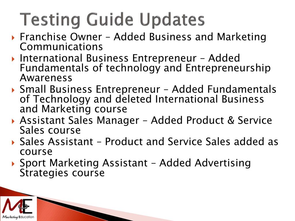 Testing Guide Updates • Franchise Owner – Added Business and Marketing Communications • International Business Entrepreneur – Added Fundamentals of technology and Entrepreneurship Awareness • Small Business Entrepreneur – Added Fundamentals of Technology and deleted International Business and Marketing course • Assistant Sales Manager – Added Product & Service Sales course • Sales Assistant – Product and Service Sales added as course • Sport Marketing Assistant – Added Advertising Strategies course