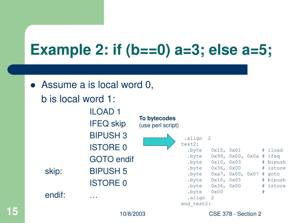 Example 2: if (b==0) a=3; else a=5; • Assume a is local word 0, b is local word 1: ILOAD 1 IFEQ skip BIPUSH 3 ISTORE 0 GOTO endif skip: BIPUSH 5 ISTORE 0 endif: … To bytecodes (use perl script) .align 2 test2: .byte 0x15, 0x01 # iload .byte 0x99, 0x00, 0x0a # ifeq .byte 0x10, 0x03 # bipush .byte 0x36, 0x00 # istore .byte 0xa7, 0x00, 0x07 # goto .byte 0x10, 0x05 # bipush .byte 0x36, 0x00 # istore .byte 0x00 # .align 2 end_test2: CSE 378 - Section 2