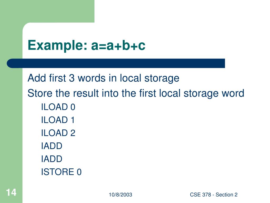 Example: a=a+b+c Add first 3 words in local storage Store the result into the first local storage word ILOAD 0 ILOAD 1 ILOAD 2 IADD IADD ISTORE 0 CSE 378 - Section 2