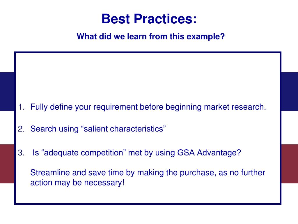 Fully define your requirement before beginning market research. Search using “salient characteristics” Is “adequate competition” met by using GSA Advantage? Streamline and save time by making the purchase, as no further action may be necessary! Best Practices:What did we learn from this example?