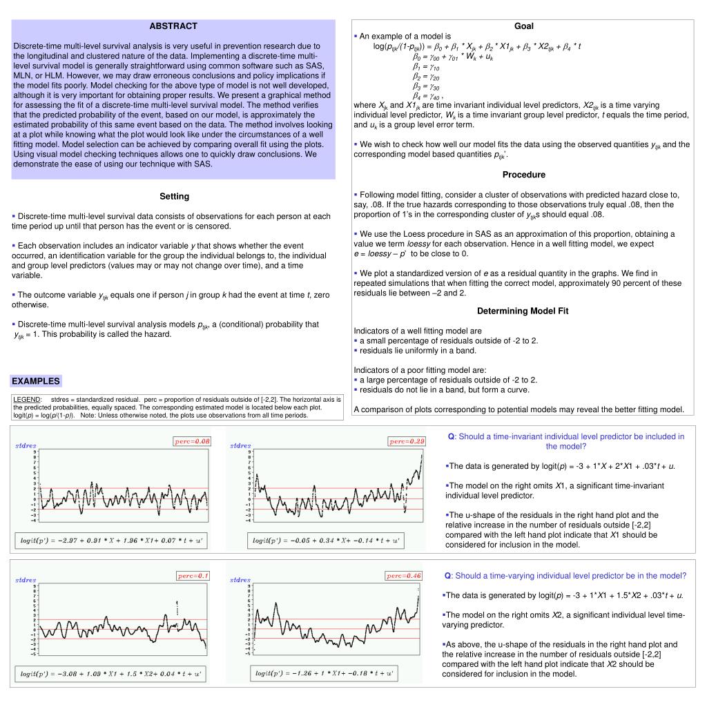 ABSTRACT Discrete-time multi-level survival analysis is very useful in prevention research due to the longitudinal and clustered nature of the data. Implementing a discrete-time multi-level survival model is generally straightforward using common software such as SAS, MLN, or HLM. However, we may draw erroneous conclusions and policy implications if the model fits poorly. Model checking for the above type of model is not well developed, although it is very important for obtaining proper results. We present a graphical method for assessing the fit of a discrete-time multi-level survival model. The method verifies that the predicted probability of the event, based on our model, is approximately the estimated probability of this same event based on the data. The method involves looking at a plot while knowing what the plot would look like under the circumstances of a well fitting model. Model selection can be achieved by comparing overall fit using the plots. Using visual model checking techniques allows one to quickly draw conclusions. We demonstrate the ease of using our technique with SAS. • Goal • An example of a model is • log(ptjk/(1-ptjk)) = b0 + b1 * Xjk + b2 * X1jk + b3 * X2tjk + b4 * t • b0 = g00 + g01 * Wk + uk • b1 = g10 • b2 = g20 • b3 = g30 • b4 = g40 , • where Xjk and X1jk are time invariant individual level predictors, X2tjk is a time varying individual level predictor, Wk is a time invariant group level predictor, t equals the time period, and uk is a group level error term. • We wish to check how well our model fits the data using the observed quantities ytjk and the corresponding model based quantities ptjk’. • Procedure • Following model fitting, consider a cluster of observations with predicted hazard close to, say, .08. If the true hazards corresponding to those observations truly equal .08, then the proportion of 1’s in the corresponding cluster of ytjks should equal .08. • We use the Loess procedure in SAS as an approximation of this proportion, obtaining a value we term loessy for each observation. Hence in a well fitting model, we expect e = loessy – p’to be close to 0. • We plot a standardized version of e as a residual quantity in the graphs. We find in repeated simulations that when fitting the correct model, approximately 90 percent of these residuals lie between –2 and 2. • Determining Model Fit • Indicators of a well fitting model are • a small percentage of residuals outside of -2 to 2. • residuals lie uniformly in a band. • Indicators of a poor fitting model are: • a large percentage of residuals outside of -2 to 2. • residuals do not lie in a band, but form a curve. • A comparison of plots corresponding to potential models may reveal the better fitting model. • Setting • Discrete-time multi-level survival data consists of observations for each person at each time period up until that person has the event or is censored. • Each observation includes an indicator variable y that shows whether the event occurred, an identification variable for the group the individual belongs to, the individual and group level predictors (values may or may not change over time), and a time variable. • The outcome variable ytjk equals one if person j in group k had the event at time t, zero otherwise. • Discrete-time multi-level survival analysis models ptjk, a (conditional) probability that ytjk = 1. This probability is called the hazard. EXAMPLES LEGEND: stdres = standardized residual. perc = proportion of residuals outside of [-2,2]. The horizontal axis is the predicted probabilities, equally spaced. The corresponding estimated model is located below each plot. logit(p) = log(p/(1-p)). Note: Unless otherwise noted, the plots use observations from all time periods. Q: Should a time-invariant individual level predictor be included in the model? • The data is generated by logit(p) = -3 + 1*X + 2*X1 + .03*t + u. • The model on the right omits X1, a significant time-invariant individual level predictor. • The u-shape of the residuals in the right hand plot and the relative increase in the number of residuals outside [-2,2] compared with the left hand plot indicate that X1 should be considered for inclusion in the model. Q: Should a time-varying individual level predictor be in the model? • The data is generated by logit(p) = -3 + 1*X1 + 1.5*X2 + .03*t + u. • The model on the right omits X2, a significant individual level time-varying predictor. • As above, the u-shape of the residuals in the right hand plot and the relative increase in the number of residuals outside [-2,2] compared with the left hand plot indicate that X2 should be considered for inclusion in the model.