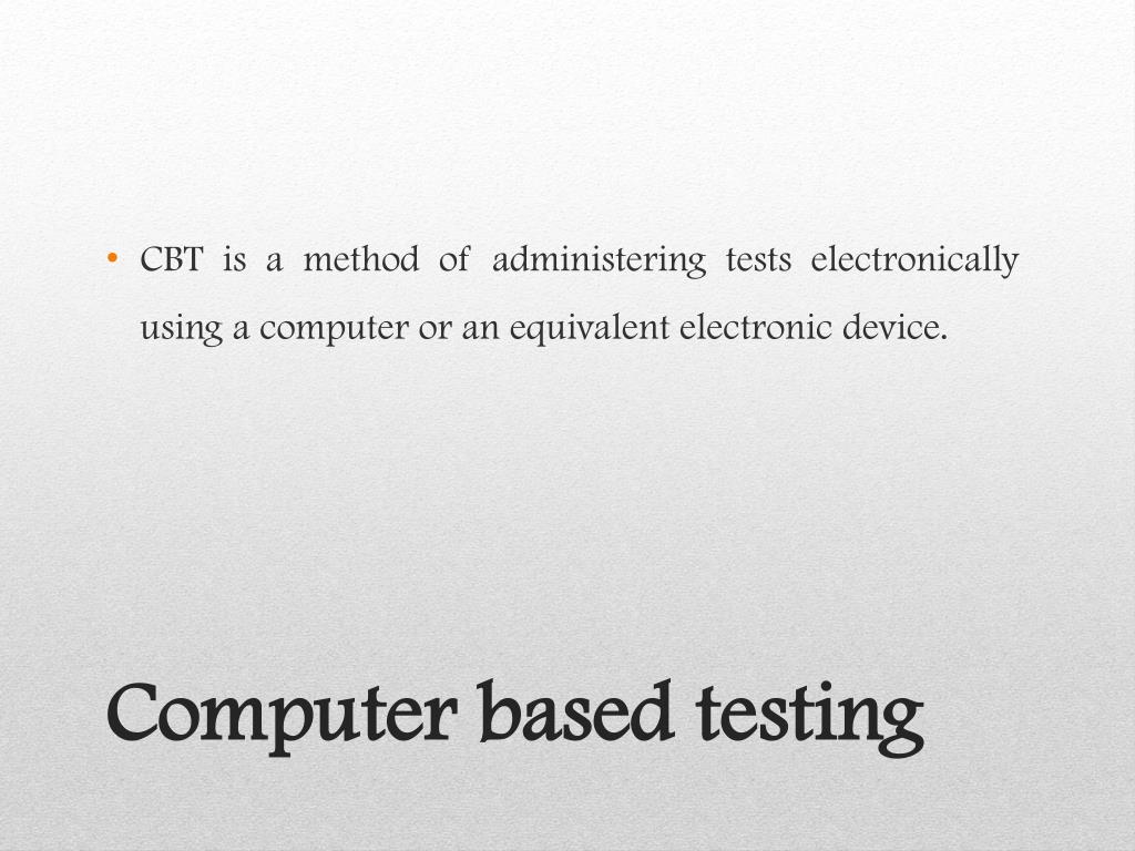 CBT is a method of administering tests electronically using a computer or an equivalent electronic device. Computer based testing