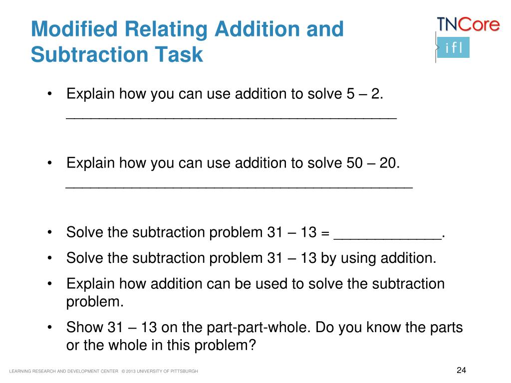 Modified Relating Addition and Subtraction Task • Explain how you can use addition to solve 5 – 2. ________________________________________ • Explain how you can use addition to solve 50 – 20.__________________________________________ • Solve the subtraction problem 31 – 13 = _____________. • Solve the subtraction problem 31 – 13 by using addition. • Explain how addition can be used to solve the subtraction problem. • Show 31 – 13 on the part-part-whole. Do you know the parts or the whole in this problem?