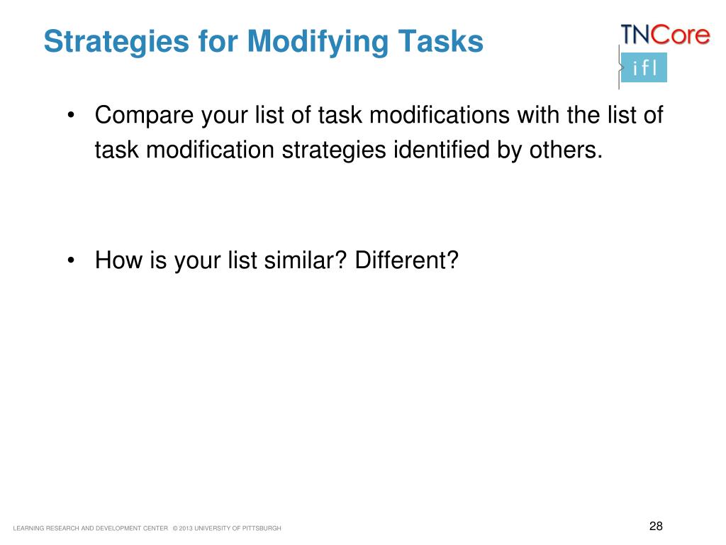 Strategies for Modifying Tasks Compare your list of task modifications with the list of task modification strategies identified by others. How is your list similar? Different?