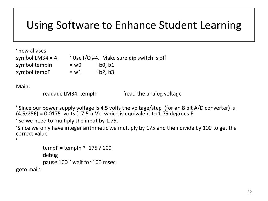 Using Software to Enhance Student Learning Students are given the following program as a starting point: ' I/O Pin Aliases symbol LM34 = 4 ‘ Use I/O #4. Make sure dip switch is off symbol tempIn = w0 ' b0, b1 Main: readadc LM34, tempIn‘read the analog voltage debug pause 100 ‘ wait for 100 msec goto main