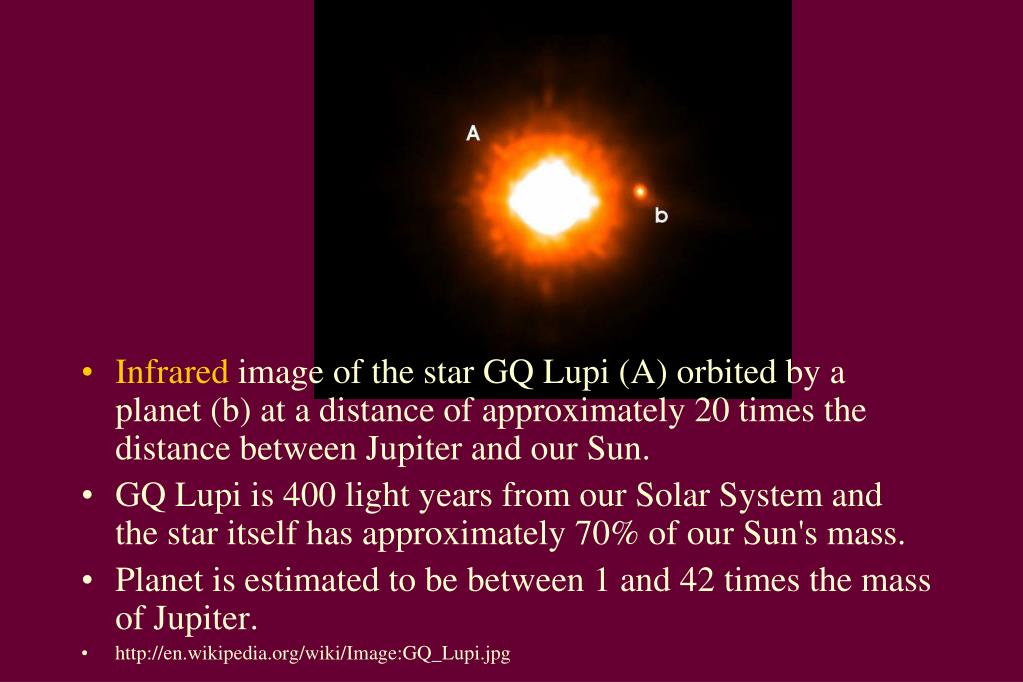 Infrared image of the star GQ Lupi (A) orbited by a planet (b) at a distance of approximately 20 times the distance between Jupiter and our Sun. • GQ Lupi is 400 light years from our Solar System and the star itself has approximately 70% of our Sun's mass. • Planet is estimated to be between 1 and 42 times the mass of Jupiter. • http://en.wikipedia.org/wiki/Image:GQ_Lupi.jpg