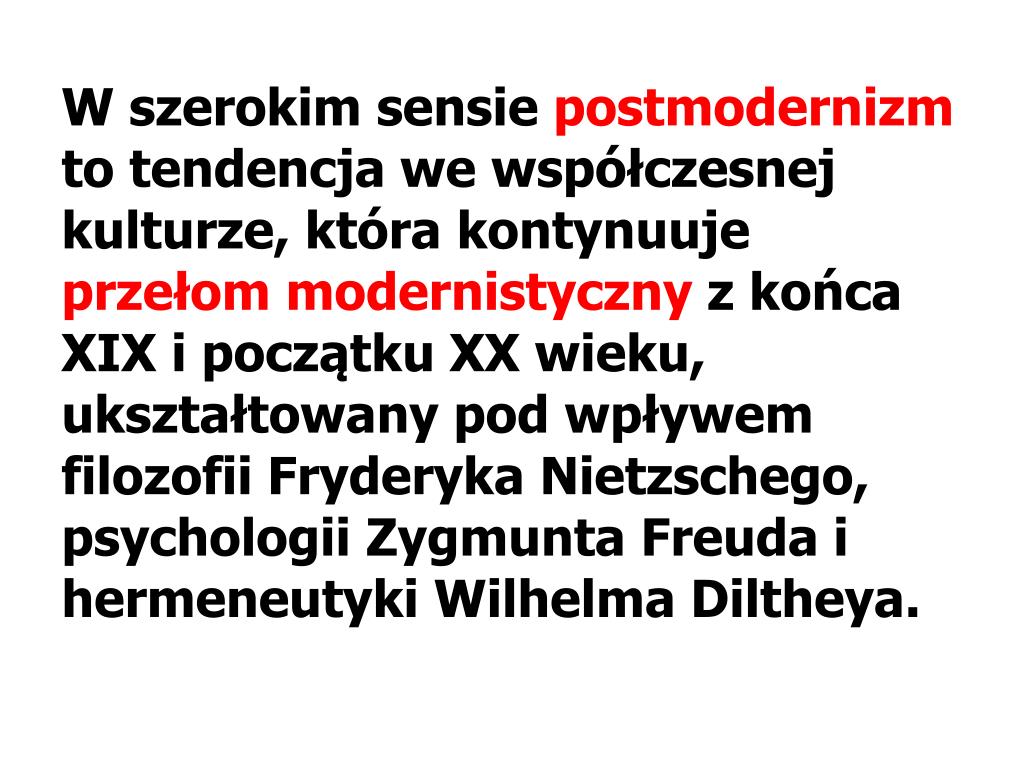 W szerokim sensie postmodernizm to tendencja we współczesnej kulturze, która kontynuuje przełom modernistyczny z końca XIX i początku XX wieku, ukształtowany pod wpływem filozofii Fryderyka Nietzschego, psychologii Zygmunta Freuda i hermeneutyki Wilhelma Diltheya.