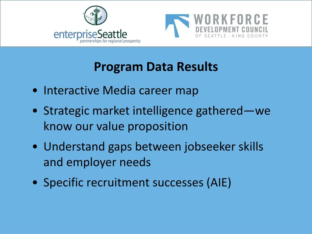 Program Data Results • Interactive Media career map • Strategic market intelligence gathered—we know our value proposition • Understand gaps between jobseeker skills and employer needs • Specific recruitment successes (AIE)