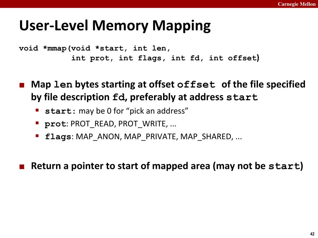User-Level Memory Mapping void *mmap(void *start, intlen, intprot, int flags, intfd, int offset) lenbytes start (or address chosen by kernel) lenbytes offset (bytes) 0 0 Disk file specified by file descriptor fd Process virtual memory