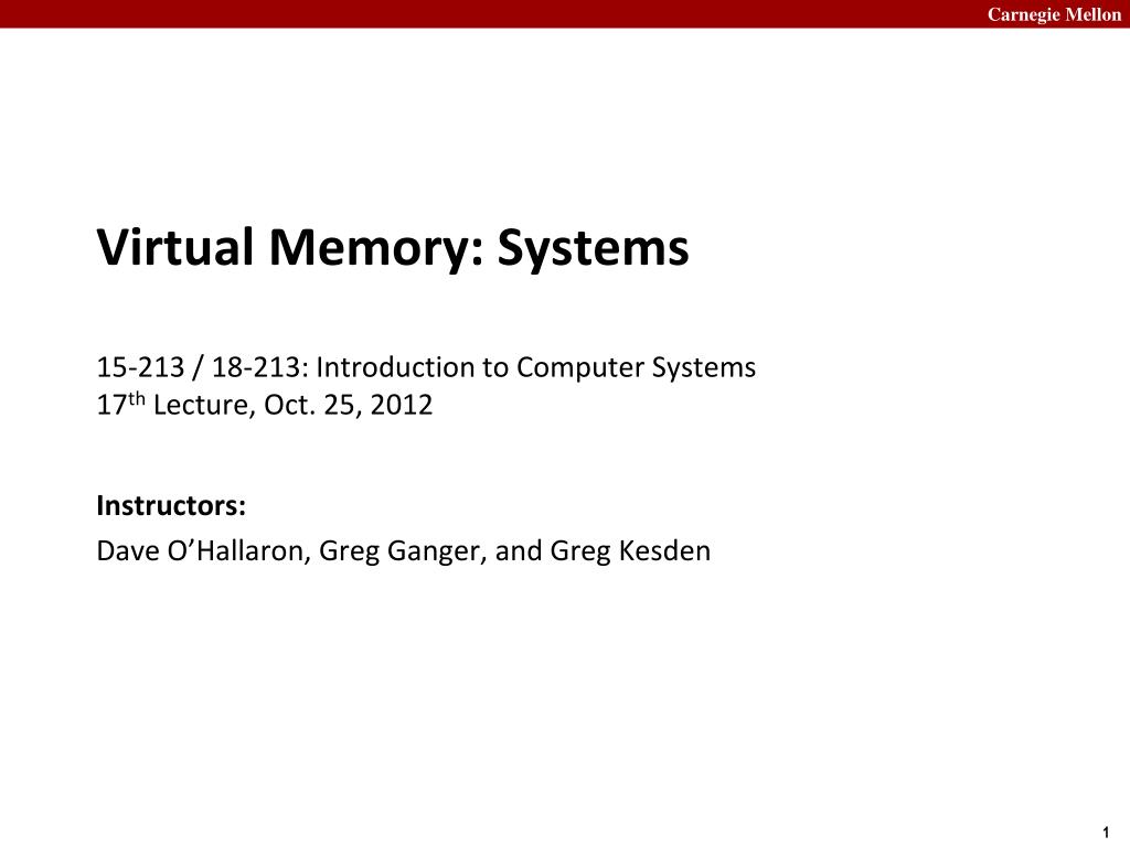 Virtual Memory: Systems15-213 / 18-213: Introduction to Computer Systems 17th Lecture, Oct. 25, 2012 Instructors: Dave O’Hallaron, Greg Ganger, and Greg Kesden
