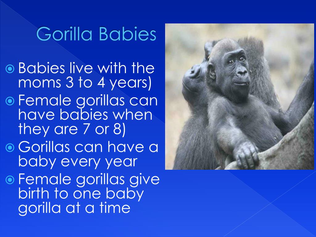 Gorilla Babies • Babies live with the moms 3 to 4 years) • Female gorillas can have babies when they are 7 or 8) • Gorillas can have a baby every year • Female gorillas give birth to one baby gorilla at a time