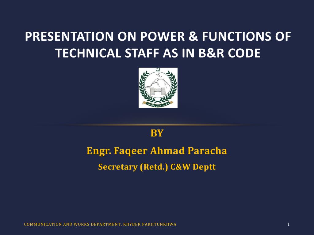 PRESENTATION ON Power & Functions of technical staff as in B&R CODE BY Engr. Faqeer Ahmad Paracha Secretary (Retd.) C&W Deptt COMMUNICATION AND WORKS DEPARTMENT, KHYBER PAKhTUNKHWA