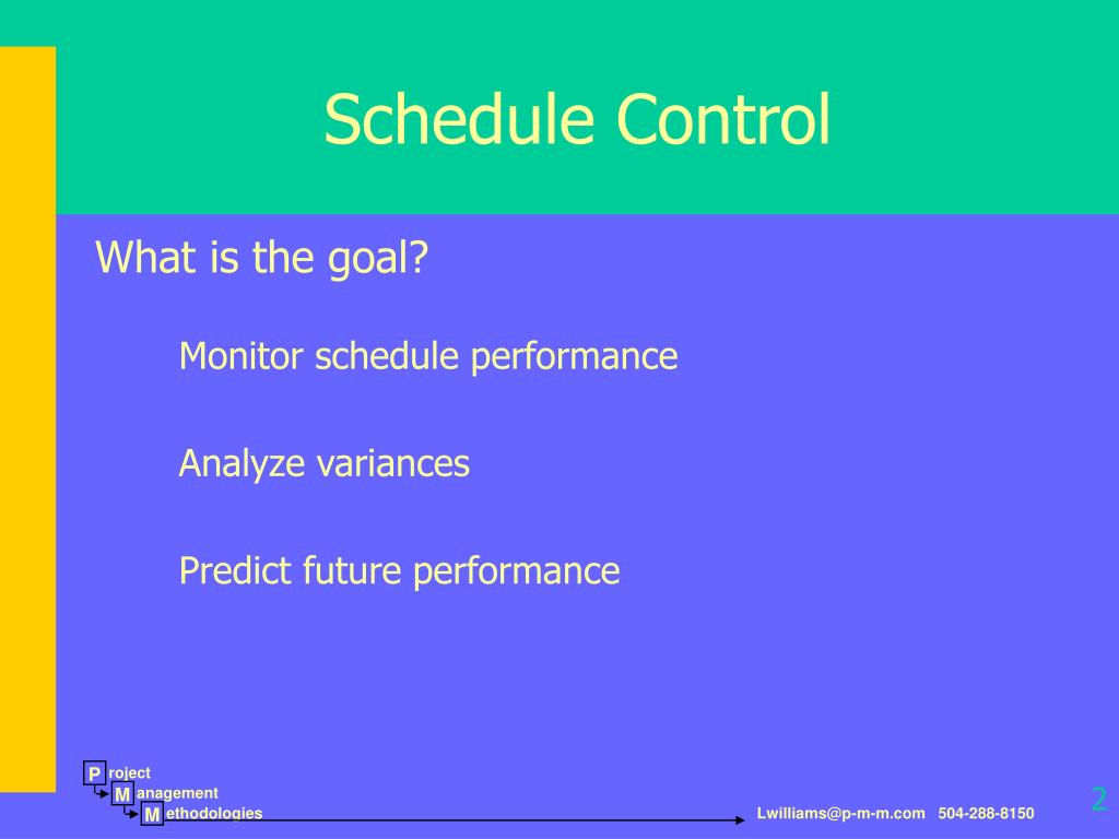 Schedule Control with Microsoft Project 2003. Laura Williams, PMP. P. roject. M. anagement. 1. M. ethodologies. What is the goal?. Schedule Control. Monitor schedule performance Analyze variances Predict future performance . 2. What is the process?. Baseline at project’s start