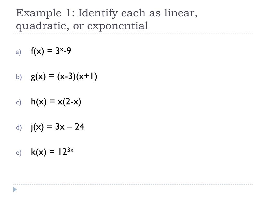 Example 1: Identify each as linear, quadratic, or exponential • f(x) = 3x-9 • g(x) = (x-3)(x+1) • h(x) = x(2-x) • j(x) = 3x – 24 • k(x) = 123x