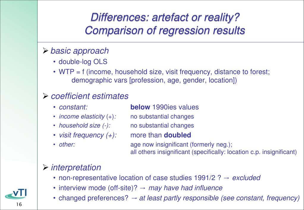 Differences: artefact or reality?Comparison of regression results • basic approach • double-log OLS • WTP = f (income, household size, visit frequency, distance to forest; demographic vars [profession, age, gender, location]) • coefficient estimates • constant:below 1990ies values • income elasticity (+): no substantial changes • household size (-): no substantial changes • visit frequency (+): more than doubled • other: age now insignificant (formerly neg.); all others insignificant (specifically: location c.p. insignificant) • interpretation • non-representative location of case studies 1991/2 ? → excluded • interview mode (off-site)? → may have had influence • changed preferences? → at least partly responsible (see constant, frequency)