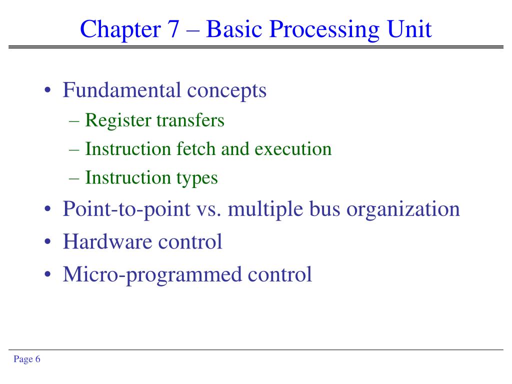 Chapter 7 – Basic Processing Unit • Fundamental concepts • Register transfers • Instruction fetch and execution • Instruction types • Point-to-point vs. multiple bus organization • Hardware control • Micro-programmed control