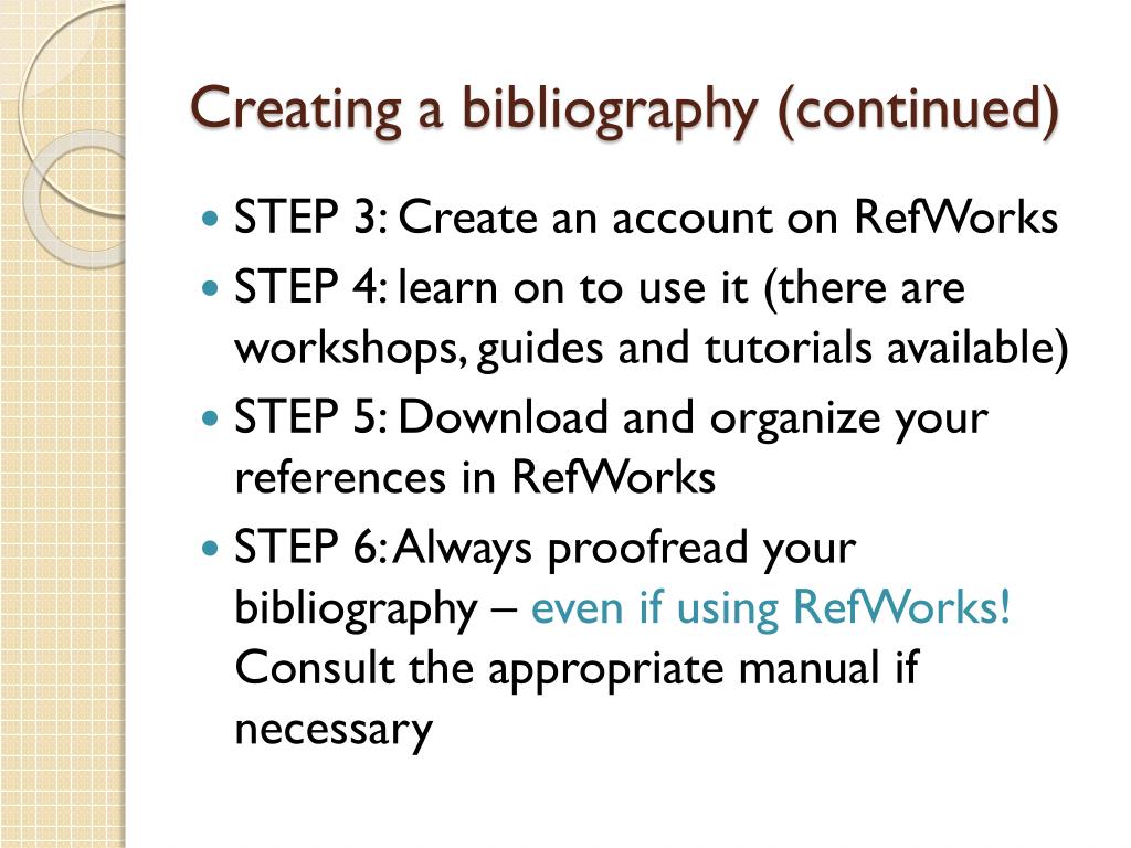 Creating a bibliography (continued) • STEP 3: Create an account on RefWorks • STEP 4: learn on to use it (there are workshops, guides and tutorials available) • STEP 5: Download and organize your references in RefWorks • STEP 6: Always proofread your bibliography – even if using RefWorks! Consult the appropriate manual if necessary