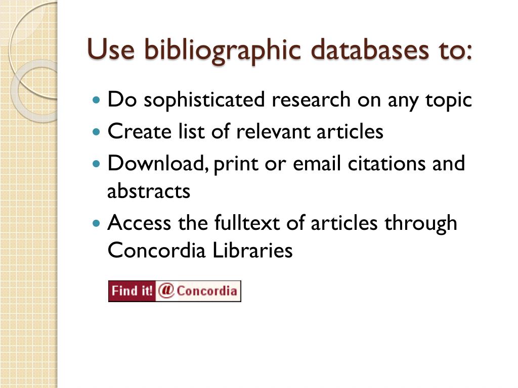 Use bibliographic databases to: • Do sophisticated research on any topic • Create list of relevant articles • Download, print or email citations and abstracts • Access the fulltext of articles through Concordia Libraries