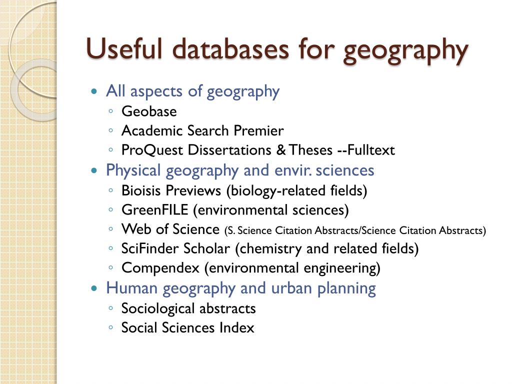 Useful databases for geography • All aspects of geography • Geobase • Academic Search Premier • ProQuest Dissertations & Theses --Fulltext • Physical geography and envir. sciences • Bioisis Previews (biology-related fields) • GreenFILE (environmental sciences) • Web of Science (S. Science Citation Abstracts/Science Citation Abstracts) • SciFinder Scholar (chemistry and related fields) • Compendex (environmental engineering) • Human geography and urban planning • Sociological abstracts • Social Sciences Index