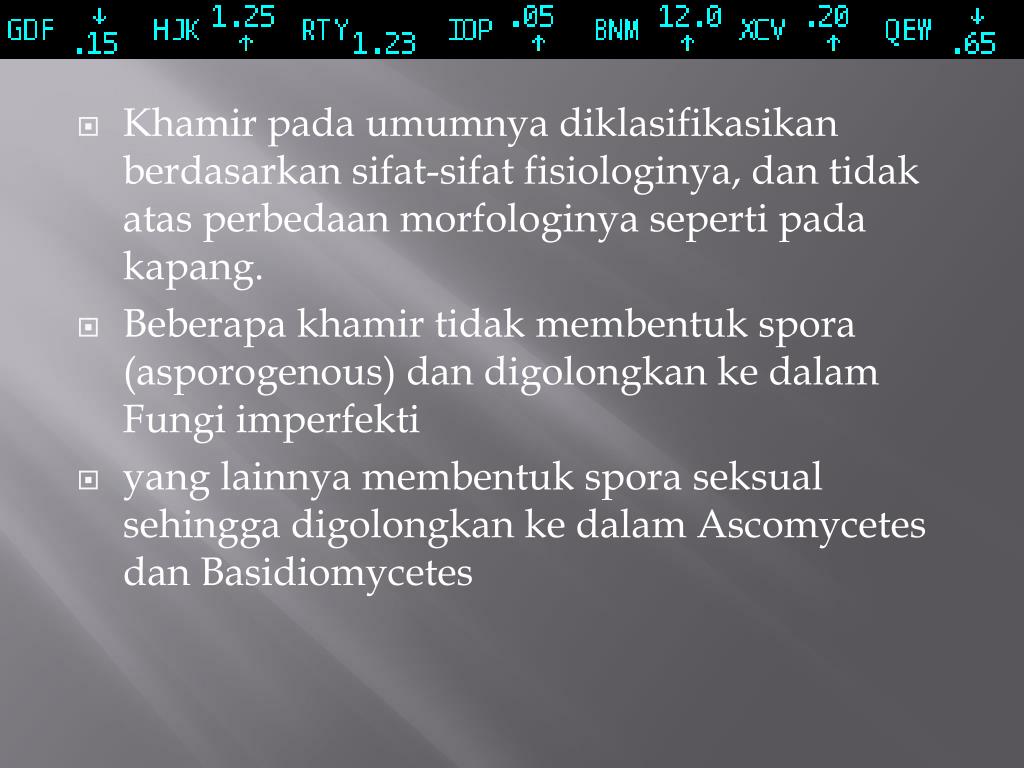 Sifat-sifatBeberapaKhamirMakanan KelompokKhamirSejati (True Yeasts) • Kebanyakankhamir yang digunakandalamindustritermasukdalamkelasAscomycetes, terutamajenisSaccharomyces. • Dalamindustrifermentasi yang meng-gunakankhamirdikenalistilahkhamir liar (wild yeast), yaitukhamir yang tidakdiingin-kantumbuhdalamsuatufermentasi. • Jadikhamir yang digunakandalamsuatuindustri, jikamengkontaminasiindustrilainnya yang menggunakankhamirberbedadapatdisebutkhamir liar. • Khamiryang seringmenimbulkanmasalahdalamindustrifermentasiadalah yang tergolongkhamirtidakberspora (asporogenous) ataudisebut “false yeasts”.