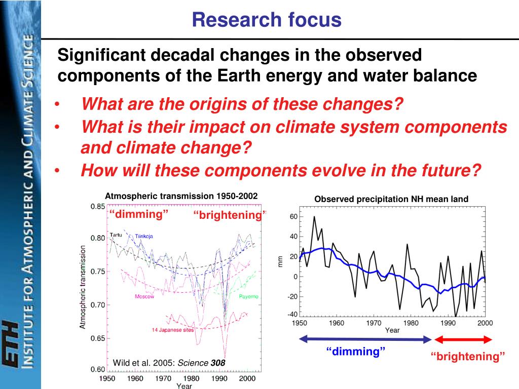 Research focus Significant decadal changes in the observed components of the Earth energy and water balance • What are the origins of these changes? • What is their impact on climate system components and climate change? • How will these components evolve in the future? Atmospheric transmission 1950-2002 Observed precipitation NH mean land “dimming” “brightening” “dimming” “brightening” Wild et al. 2005: Science 308