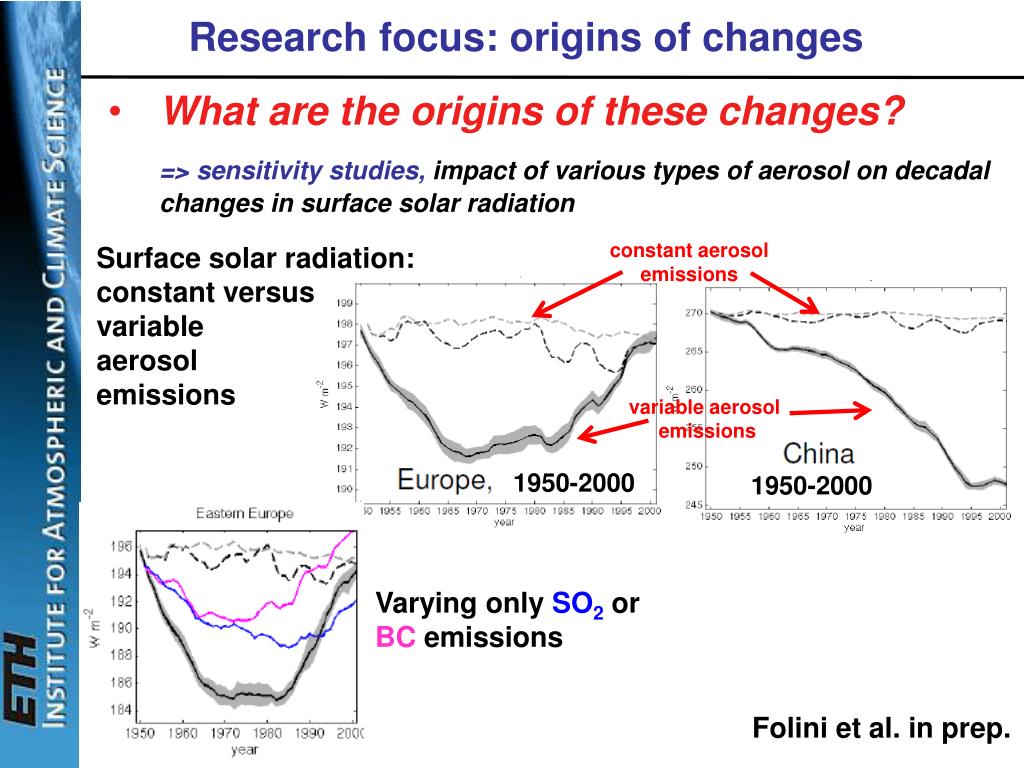 Research focus: origins of changes • What are the origins of these changes? • => sensitivity studies, impact of various types of aerosol on decadal changes in surface solar radiation constant aerosol emissions Surface solar radiation: constant versus variable aerosol emissions variable aerosol emissions 1950-2000 1950-2000 Varying only SO2or BC emissions Folini et al. in prep.