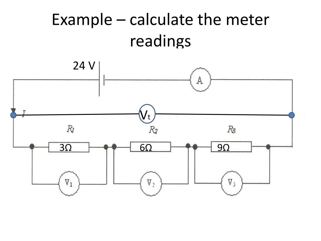 Example – calculate the meter readings 24 V Vt 3Ω 6Ω 9Ω