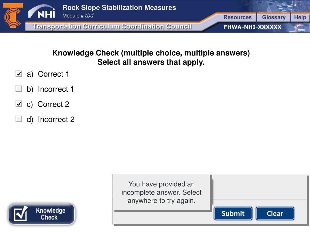 Knowledge Check (multiple choice, multiple answers)Select all answers that apply. a) Correct 1 b) Incorrect 1 c) Correct 2 d) Incorrect 2 You have provided an incomplete answer. Select anywhere to try again. Incorrect. You did not answer this question completely. You answered this correctly. Incorrect. Advance to the next slide for a debrief. Select anywhere to continue. Correct. Advance to the next slide for a debrief. Select anywhere to continue. Incorrect. Select anywhere to try again. Submit Clear The correct answer is: