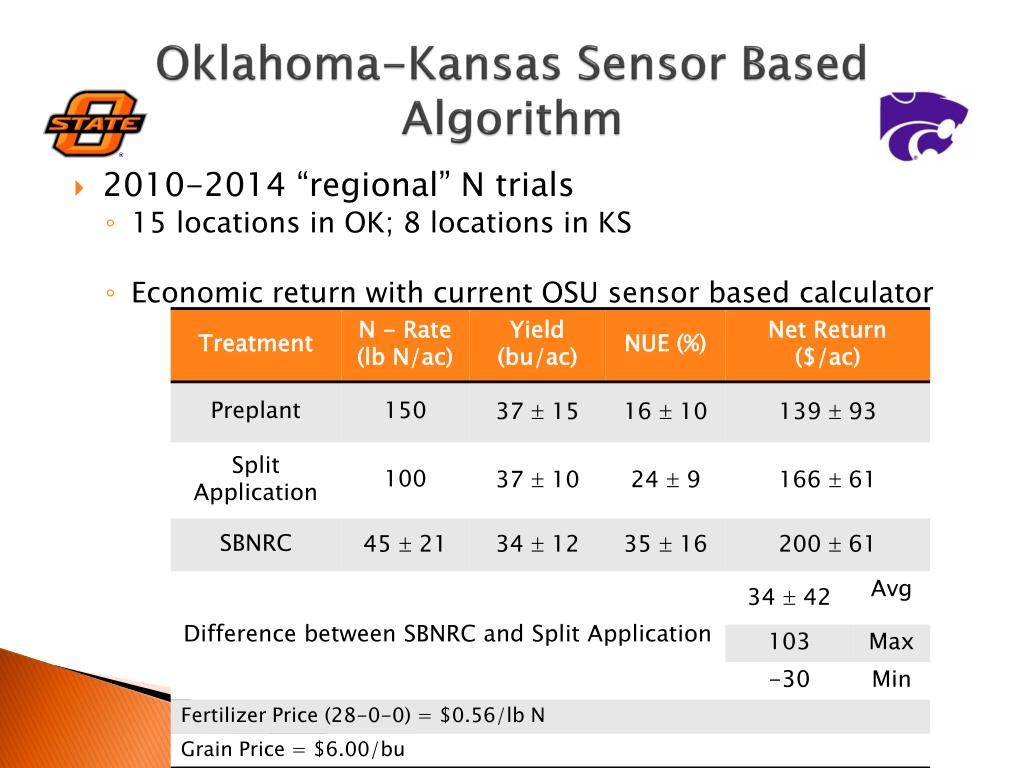 Oklahoma-Kansas Sensor Based Algorithm • 2010-2014 “regional” N trials • 15 locations in OK; 8 locations in KS • Economic return with current OSU sensor based calculator