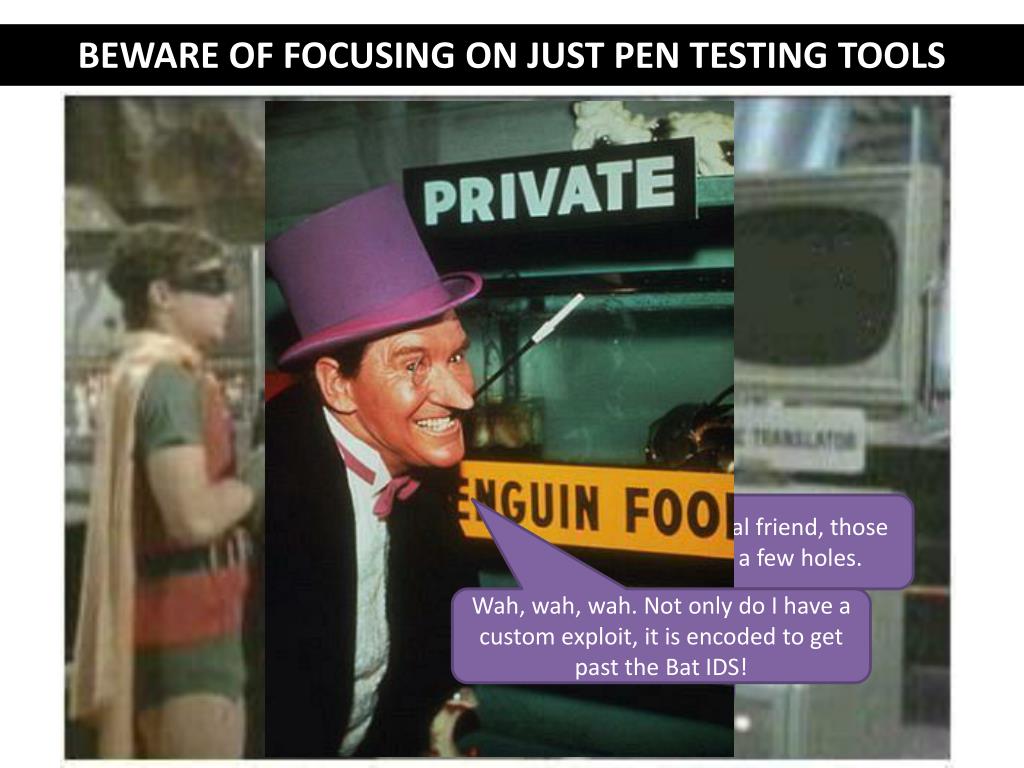 BEWARE OF FOCUSING ON JUST PEN TESTING TOOLS The jokes on him loyal friend, those tools only look for a few holes. Wah, wah, wah. Not only do I have a custom exploit, it is encoded to get past the Bat IDS! Holy MD5 checksums Batman, the Joker is using a penetration testing tool on the Bat Computer!