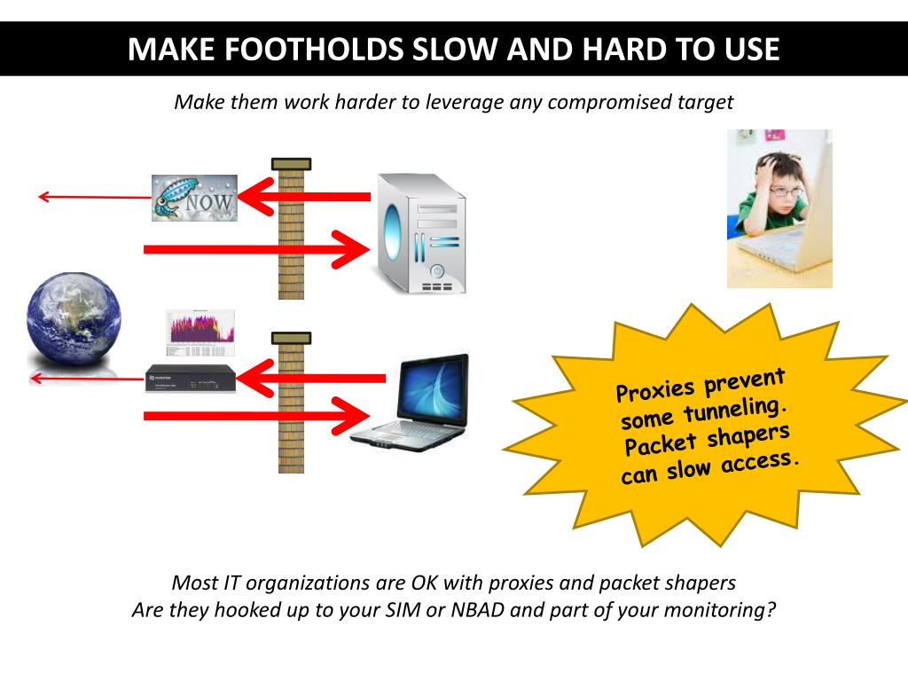 MAKE FOOTHOLDS SLOW AND HARD TO USE Make them work harder to leverage any compromised target Proxies prevent some tunneling. Packet shapers can slow access. Most IT organizations are OK with proxies and packet shapers Are they hooked up to your SIM or NBAD and part of your monitoring?