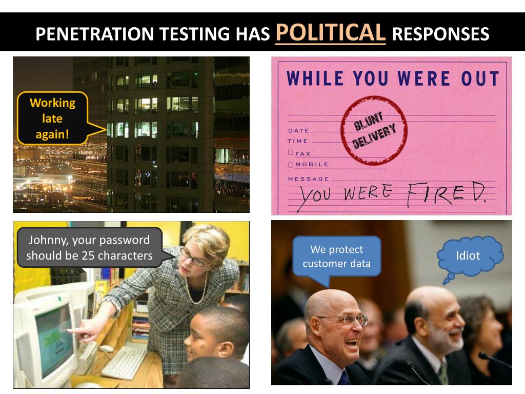PENETRATION TESTING HAS POLITICALRESPONSES Working late again! Johnny, your password should be 25 characters We protect customer data Idiot