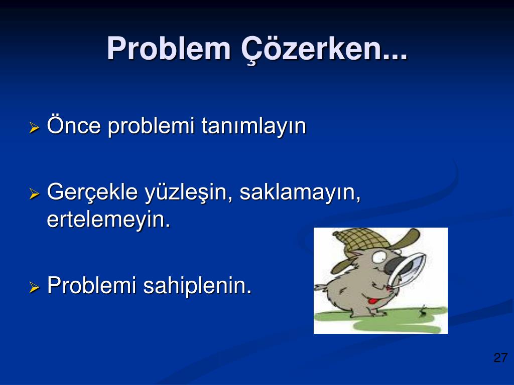 Problem Çözerken... Önce problemi tanımlayın Gerçekle yüzleşin, saklamayın, ertelemeyin. Problemi sahiplenin. 27
