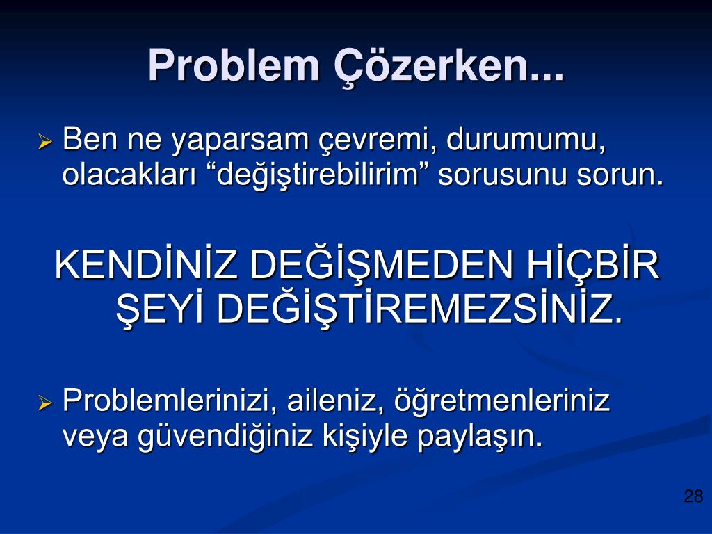 Problem Çözerken... Ben ne yaparsam çevremi, durumumu, olacakları “değiştirebilirim” sorusunu sorun. KENDİNİZ DEĞİŞMEDEN HİÇBİR ŞEYİ DEĞİŞTİREMEZSİNİZ. Problemlerinizi, aileniz, öğretmenleriniz veya güvendiğiniz kişiyle paylaşın. 28