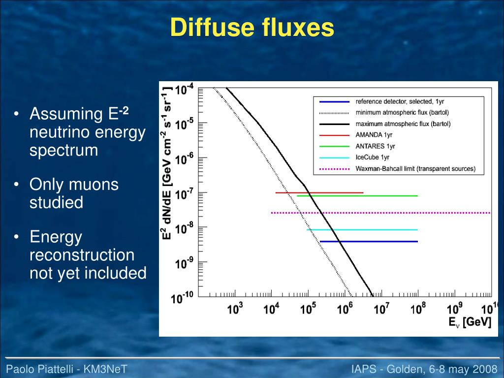 Diffuse fluxes • Assuming E-2neutrino energy spectrum • Only muonsstudied • Energy reconstruction not yet included