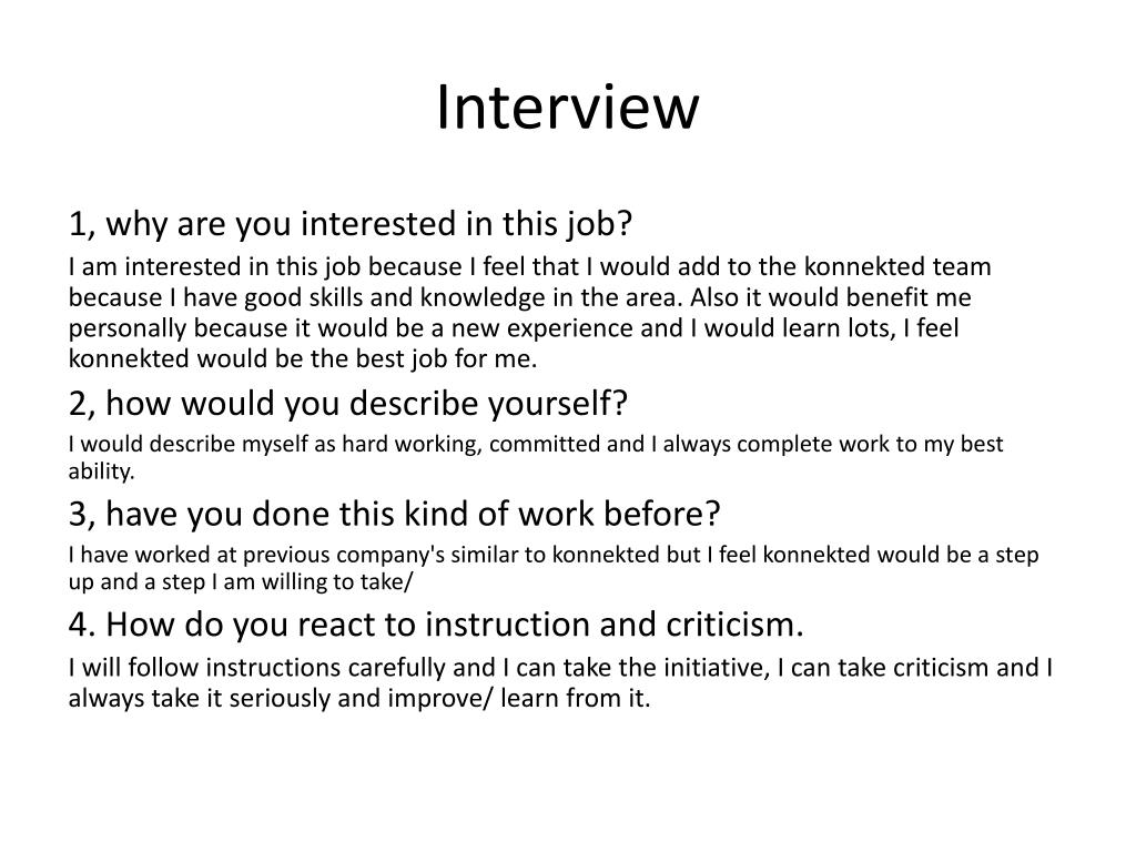 Interview 1, why are you interested in this job? I am interested in this job because I feel that I would add to the konnekted team because I have good skills and knowledge in the area. Also it would benefit me personally because it would be a new experience and I would learn lots, I feel konnekted would be the best job for me. 2, how would you describe yourself? I would describe myself as hard working, committed and I always complete work to my best ability. 3, have you done this kind of work before? I have worked at previous company's similar to konnekted but I feelkonnekted would be a step up and a step I am willing to take/ 4. How do you react to instruction and criticism. I will follow instructions carefully and I can take the initiative, I can take criticism and I always take it seriously and improve/ learn from it.