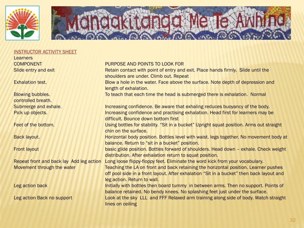 INSTRUCTOR ACTIVITY SHEET Learners COMPONENT PURPOSE AND POINTS TO LOOK FOR Slide entry and exit Retain contact with point of entry and exit. Place hands firmly. Slide until the shoulders are under. Climb out. Repeat Exhalation test. Blow a hole in the water. Face above the surface. Note depth of depression and length of exhalation. Blowing bubbles. To teach that each time the head is submerged there is exhalation. Normal controlled breath. Submerge and exhale. Increasing confidence. Be aware that exhaling reduces buoyancy of the body. Pick up objects. Increasing confidence and practising exhalation. Head first for learners may be difficult. Bounce down bottom first Feet of the bottom. Using bottles for stability. “Sit in a bucket” Upright squat position. Arms out straight chin on the surface. Back layout. Horizontal body position. Bottles level with waist. legs together. No movement body at balance. Return to “sit in a bucket” position. Front layout basic glide position. Bottles forward of shoulders. Head down – exhale. Check weight distribution. After exhalation return to squat position. Repeat front and back lay Add leg action Long loose flippy-floppy feet. Eliminate the word kick from your vocabulary. Movement through the water Teaching the LA on front and back retaining the horizontal position. Learner pushes off pool side in a front layout. After exhalation “Sit in a bucket” then back layout and leg action. Return to wall. Leg action back Initially with bottles then board tummy in between arms. Then no support. Points of balance retained. No bendy knees. No splashing feet just under the surface. Leg action Back no support Look at the sky LLL and FFF Relaxed arm training along side of body. Watch straight lines on ceiling