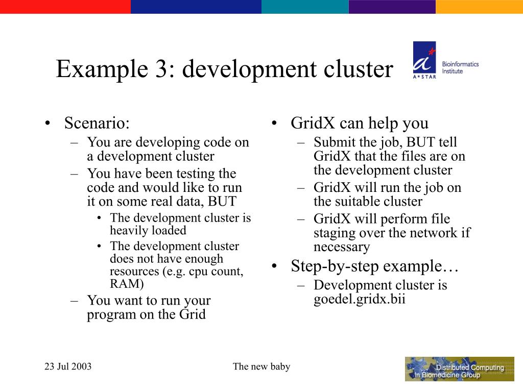 Scenario: You are developing code on a development cluster You have been testing the code and would like to run it on some real data, BUT The development cluster is heavily loaded The development cluster does not have enough resources (e.g. cpu count, RAM) You want to run your program on the Grid GridX can help you Submit the job, BUT tell GridX that the files are on the development cluster GridX will run the job on the suitable cluster GridX will perform file staging over the network if necessary Step-by-step example… Development cluster is goedel.gridx.bii Example 3: development cluster The new baby