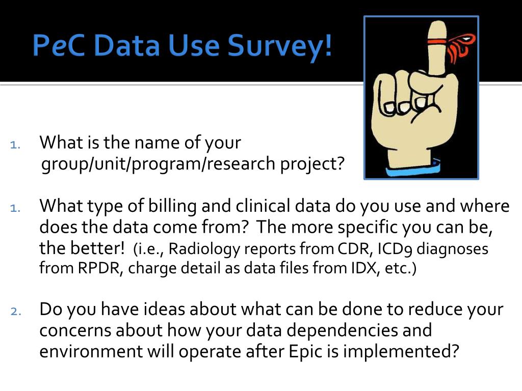 PeC Data Use Survey! • What is the name of your group/unit/program/research project? • What type of billing and clinical data do you use and where does the data come from? The more specific you can be, the better! (i.e., Radiology reports from CDR, ICD9 diagnoses from RPDR, charge detail as data files from IDX, etc.) • Do you have ideas about what can be done to reduce your concerns about how your data dependencies and environment will operate after Epic is implemented?