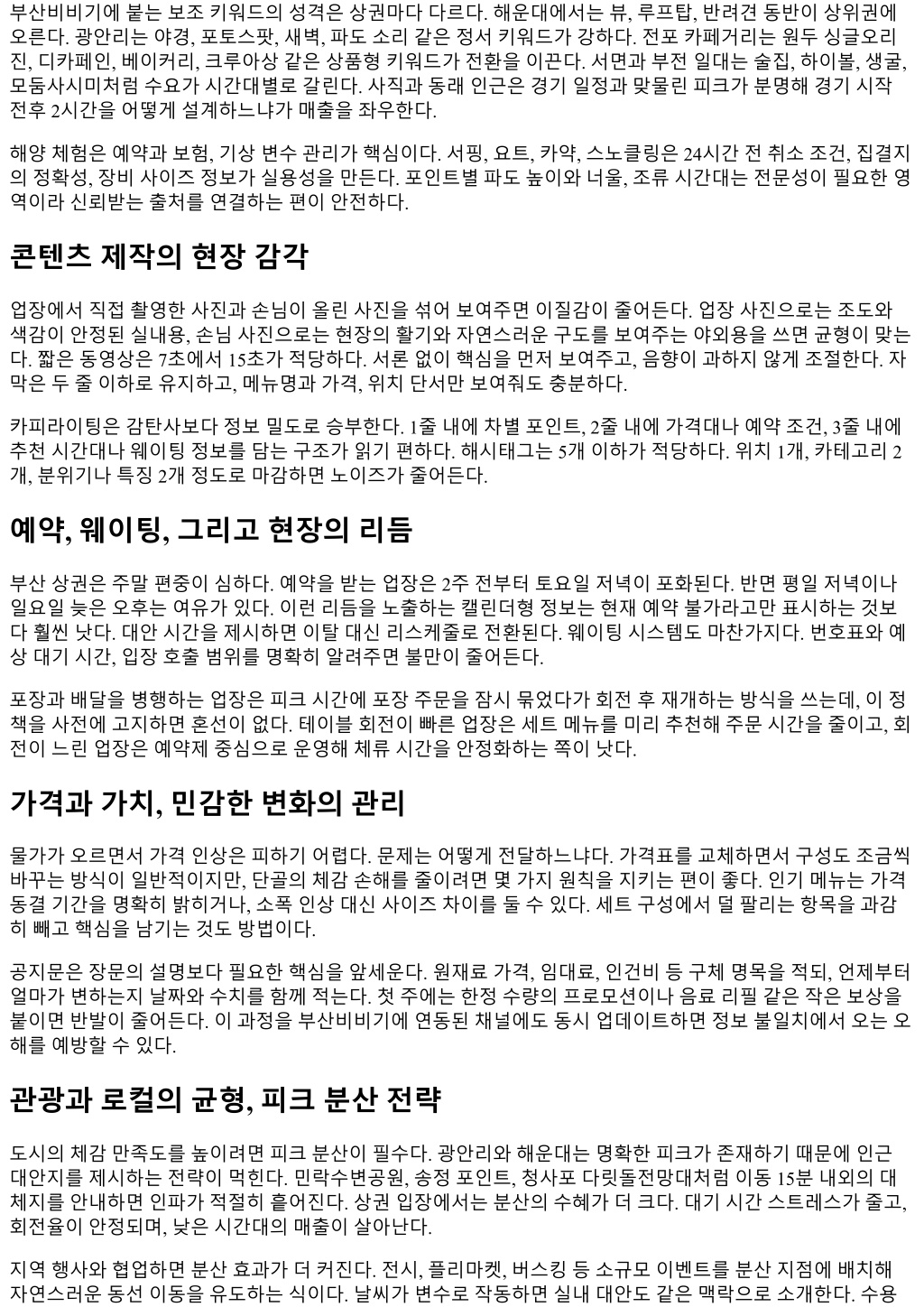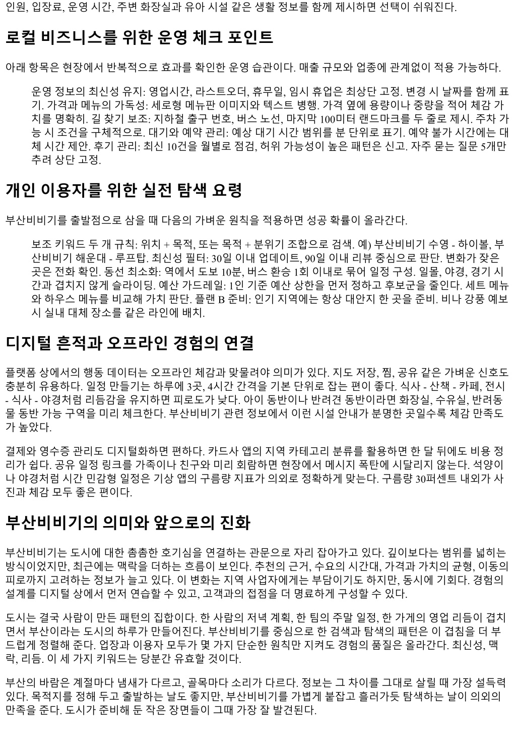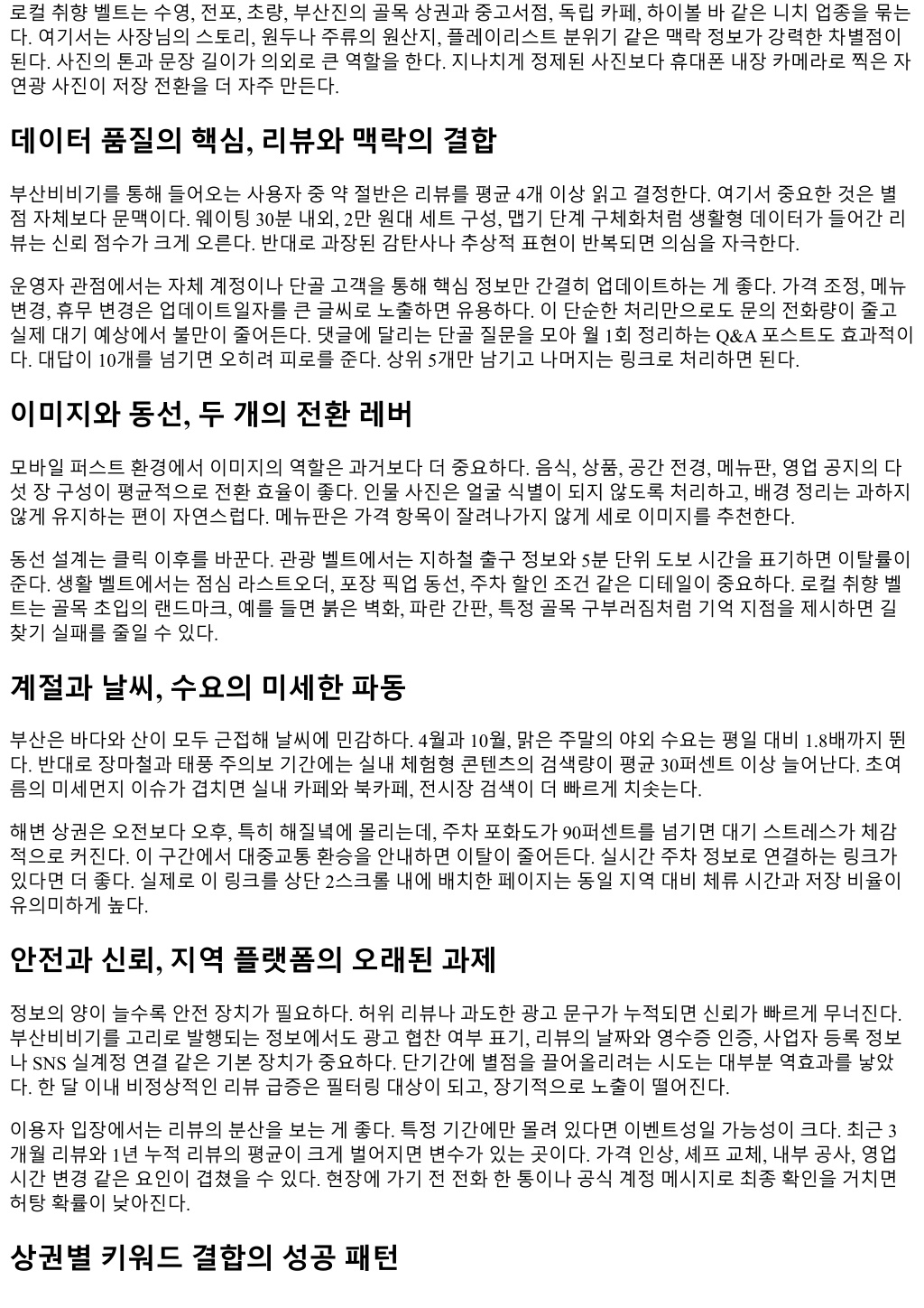 로컬취향벨트는수영, 전포, 초량, 부산진의골목상권과중고서점, 독립카페, 하이볼바같은니치업종을묶는 다. 여기서는사장님의스토리, 원두나주류의원산지, 플레이리스트분위기같은맥락정보가강력한차별점이 된다. 사진의톤과문장길이가의외로큰역할을한다. 지나치게정제된사진보다휴대폰내장카메라로찍은자 연광사진이저장전환을더자주만든다. 데이터품질의핵심, 리뷰와맥락의결합 부산비비기를통해들어오는사용자중약절반은리뷰를평균 4개이상읽고결정한다. 여기서중요한것은별 점자체보다문맥이다. 웨이팅 30분내외, 2만원대세트구성, 맵기단계구체화처럼생활형데이터가들어간리 뷰는신뢰점수가크게오른다. 반대로과장된감탄사나추상적표현이반복되면의심을자극한다. 운영자관점에서는자체계정이나단골고객을통해핵심정보만간결히업데이트하는게좋다. 가격조정, 메뉴 변경, 휴무변경은업데이트일자를큰글씨로노출하면유용하다. 이단순한처리만으로도문의전화량이줄고 실제대기예상에서불만이줄어든다. 댓글에달리는단골질문을모아월 1회정리하는 Q&A 포스트도효과적이 다. 대답이 10개를넘기면오히려피로를준다. 상위 5개만남기고나머지는링크로처리하면된다. 이미지와동선, 두개의전환레버 모바일퍼스트환경에서이미지의역할은과거보다더중요하다. 음식, 상품, 공간전경, 메뉴판, 영업공지의다 섯장구성이평균적으로전환효율이좋다. 인물사진은얼굴식별이되지않도록처리하고, 배경정리는과하지 않게유지하는편이자연스럽다. 메뉴판은가격항목이잘려나가지않게세로이미지를추천한다. 동선설계는클릭이후를바꾼다. 관광벨트에서는지하철출구정보와 5분단위도보시간을표기하면이탈률이 준다. 생활벨트에서는점심라스트오더, 포장픽업동선, 주차할인조건같은디테일이중요하다. 로컬취향벨 트는골목초입의랜드마크, 예를들면붉은벽화, 파란간판, 특정골목구부러짐처럼기억지점을제시하면길 찾기실패를줄일수있다. 계절과날씨, 수요의미세한파동 부산은바다와산이모두근접해날씨에민감하다. 4월과 10월, 맑은주말의야외수요는평일대비 1.8배까지뛴 다. 반대로장마철과태풍주의보기간에는실내체험형콘텐츠의검색량이평균 30퍼센트이상늘어난다. 초여 름의미세먼지이슈가겹치면실내카페와북카페, 전시장검색이더빠르게치솟는다. 해변상권은오전보다오후, 특히해질녘에몰리는데, 주차포화도가 90퍼센트를넘기면대기스트레스가체감 적으로커진다. 이구간에서대중교통환승을안내하면이탈이줄어든다. 실시간주차정보로연결하는링크가 있다면더좋다. 실제로이링크를상단 2스크롤내에배치한페이지는동일지역대비체류시간과저장비율이 유의미하게높다. 안전과신뢰, 지역플랫폼의오래된과제 정보의양이늘수록안전장치가필요하다. 허위리뷰나과도한광고문구가누적되면신뢰가빠르게무너진다. 부산비비기를고리로발행되는정보에서도광고협찬여부표기, 리뷰의날짜와영수증인증, 사업자등록정보 나 SNS 실계정연결같은기본장치가중요하다. 단기간에별점을끌어올리려는시도는대부분역효과를낳았 다. 한달이내비정상적인리뷰급증은필터링대상이되고, 장기적으로노출이떨어진다. 이용자입장에서는리뷰의분산을보는게좋다. 특정기간에만몰려있다면이벤트성일가능성이크다. 최근 3 개월리뷰와 1년누적리뷰의평균이크게벌어지면변수가있는곳이다. 가격인상, 셰프교체, 내부공사, 영업 시간변경같은요인이겹쳤을수있다. 현장에가기전전화한통이나공식계정메시지로최종확인을거치면 허탕확률이낮아진다. 상권별키워드결합의성공패턴