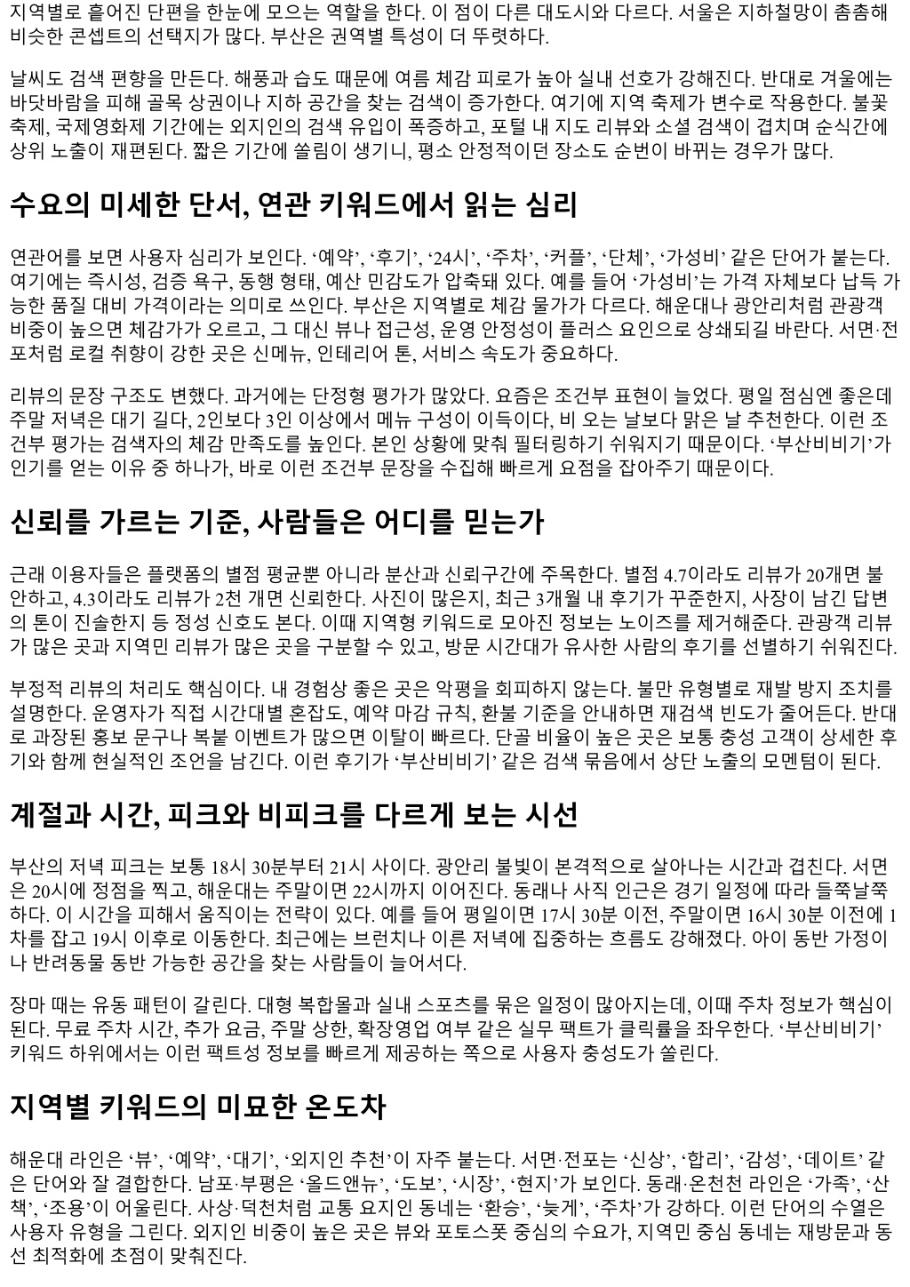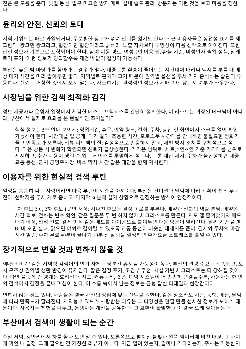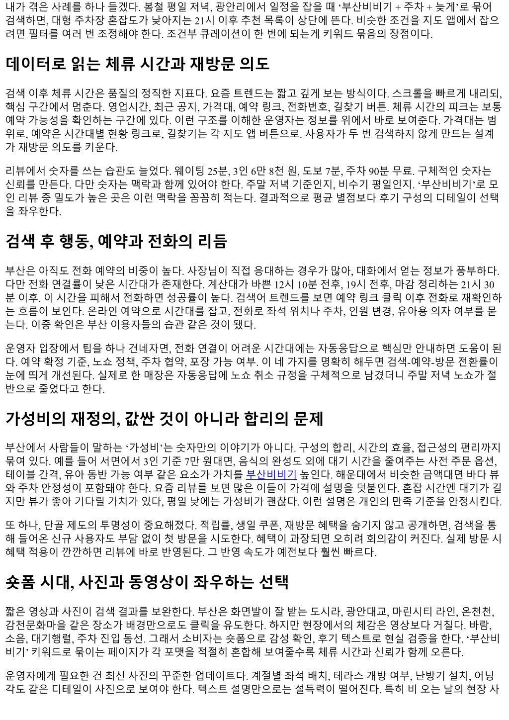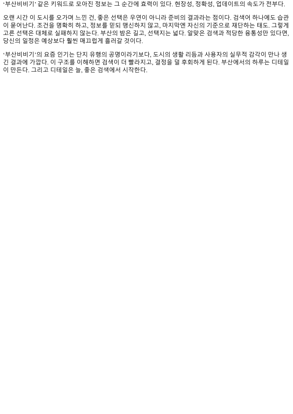 부산에서살면서체감한변화중하나는지역생활정보를찾는방식이모바일검색으로거의수렴했다는점이부산에서살면서체감한변화중하나는지역생활정보를찾는방식이모바일검색으로거의수렴했다는점이 다. 동네카페나맘카페, 오프라인전단지, 대로변간판이여전히역할을하지만, 급할때손이먼저가는곳은검 색창이다. 최근몇년간자주눈에띈키워드중하나가 ‘부산비비기’다. 특정커뮤니티나지도앱보다이단어가 가리키는묶음의정보, 즉부산지역전반의생활편의, 예약, 후기, 위치정보에빠르게접근하려는의도가담겨 있다는점이흥미롭다. 검색어자체가지역성과실용성을동시에품고있어, 왜사람들이이런키워드로모이는 지구조적으로풀어볼가치가있다. 검색어가말해주는사용자의의도 검색데이터는결국수요를비추는거울이다. ‘부산비비기’라는조합은부산이라는지리적범주와, 생활밀착형 정보묶음을암시한다. 내경험상이키워드로유입되는사람들의의도는크게세가지로나뉜다. 첫째, 오늘당 장쓸수있는정보가필요할때. 둘째, 지역기반후기검증을빠르게하고싶을때. 셋째, 지도앱상의범용결과 대신지역특유의문화를반영한큐레이션을원할때다. 예를들어해운대나서면에서급하게늦은시간에갈곳 을찾을때, 전화연결이한번에되는지, 주차나대중교통접근성은어떤지, 예약제도는어떻게운영되는지가 중요하다. 키워드자체가그실무적인욕구를압축한다. 또하나, 이용자층이세분화되고있다. 20대의경우단건, 단기형니즈가많다. 이동중검색, 카카오맵혹은네이 버지도에없는현지화된팁을찾는다. 30대이후는신뢰도와안정성을선호한다. 리뷰의품질, 계절이벤트, 아 침이나오전대운영여부같은세부가중요하다. 주중과주말, 점심과저녁의패턴이다르기때문에비슷한키워 드를반복검색한다. 이런습관은검색량의피크를특정요일과시간대에몰리게한다. 최근 2년, 체감상달라진흐름 팬데믹해제이후부산관광수요가빠르게회복되면서지역상권이재정비됐다. 해운대, 광안리, 남포, 서면, 동 래는물론이고, 동부산복합쇼핑몰과기장라인, 사상역·덕천역인근까지새로생긴공간이늘었다. 검색량은이 런변화에민감하게반응한다. 계절성도뚜렷하다. 5월과 10월, 바람이좋은달에 ‘부산비비기’ 연관검색이깜짝 상승하는데, 야외활동과저녁늦게까지이어지는일정이많아지는시기이기때문이다. 반면장마철과태풍주의 보기간에는실내중심키워드가강세를보인다. 개인적으로는새벽시간대검색도늘어난것을본다. 항공첫편이나심야고속버스이용자가증가하면서, 24시 간운영여부나새벽에열어주는곳, 청결도, 카드결제가능여부같은체크리스트성니즈가확대됐다. 사용자 리뷰의길이도길어졌다. 한두줄평이아니라방문동선, 결제, 재방문의사, 직원친절도, 동행인원수등을상 세히적는다. 그만큼검색을통해얻을수있는질적정보가두터워졌다. 부산의지리, 동선, 날씨가만드는검색편향 부산은산과바다, 강을끼고있기에이동시간의체감이크다. 해운대에서사하구를횡단하는데는평일저녁기 준 50분에서 1시간 20분까지요동친다. 그래서 ‘가깝지만괜찮은곳’ 수요가강하다. ‘부산비비기’로묶인정보는