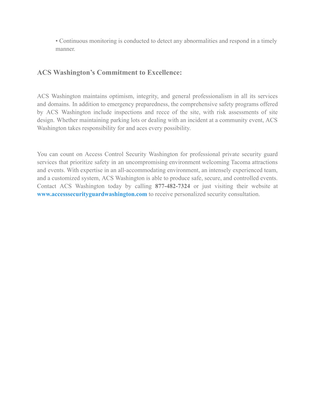 • Continuous monitoring is conducted to detect any abnormalities and respond in a timely manner. ACS Washington’s Commitment to Excellence: ACS Washington maintains optimism, integrity, and general professionalism in all its services and domains. In addition to emergency preparedness, the comprehensive safety programs offered by ACS Washington include inspections and recce of the site, with risk assessments of site design. Whether maintaining parking lots or dealing with an incident at a community event, ACS Washington takes responsibility for and aces every possibility. You can count on Access Control Security Washington for professional private security guard services that prioritize safety in an uncompromising environment welcoming Tacoma attractions and events. With expertise in an all-accommodating environment, an intensely experienced team, and a customized system, ACS Washington is able to produce safe, secure, and controlled events. Contact ACS Washington today by calling 877-482-7324 or just visiting their website at www.accesssecurityguardwashington.com to receive personalized security consultation.