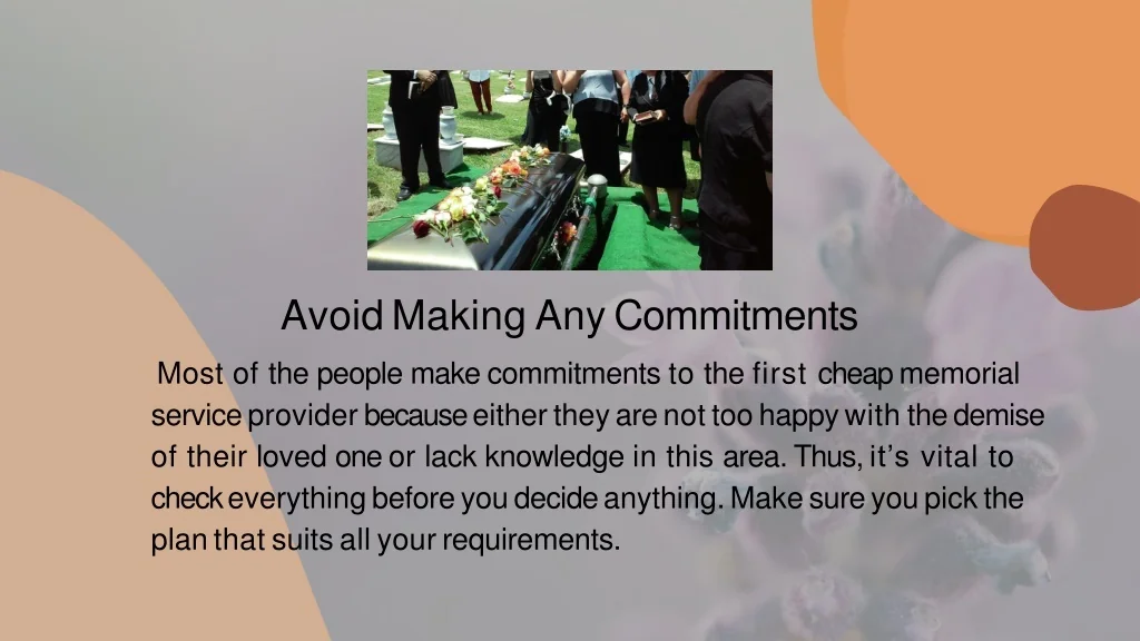 AvoidMakingAnyCommitments Most of the people make commitments to the first cheap memorial serviceproviderbecauseeithertheyarenottoohappywiththedemise of their loved one or lack knowledge in this area. Thus, it’s vital to checkeverythingbeforeyoudecideanything.Makesureyoupickthe planthatsuitsallyourrequirements.