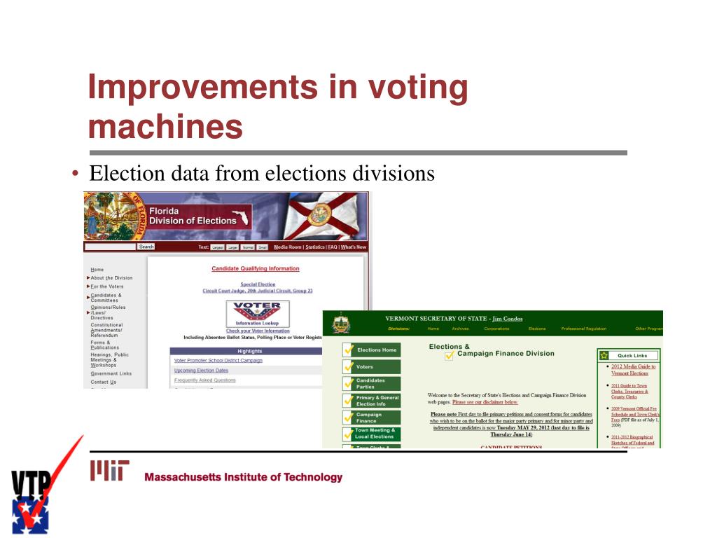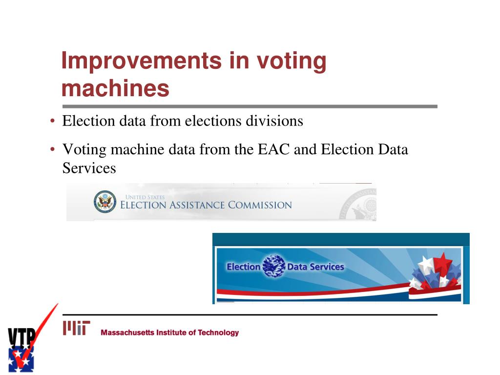 Improvements in voting machines • Election data from elections divisions • Voting machine data from the EAC and Election Data Services