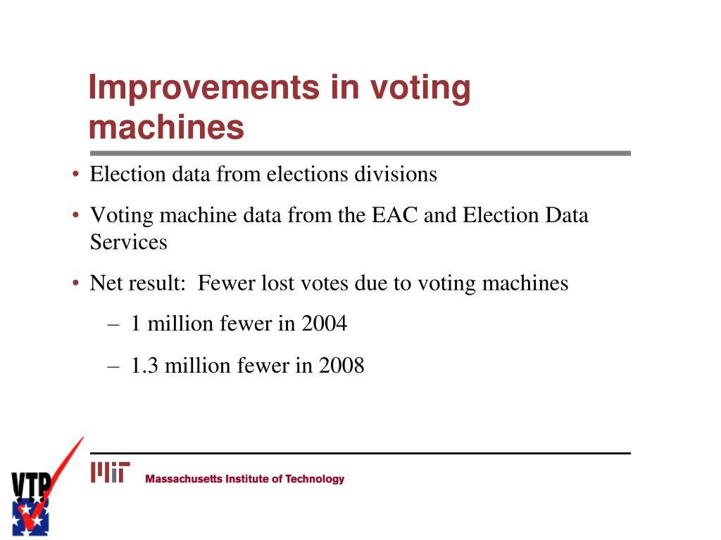 Improvements in voting machines • Election data from elections divisions • Voting machine data from the EAC and Election Data Services • Net result: Fewer lost votes due to voting machines • 1 million fewer in 2004 • 1.3 million fewer in 2008