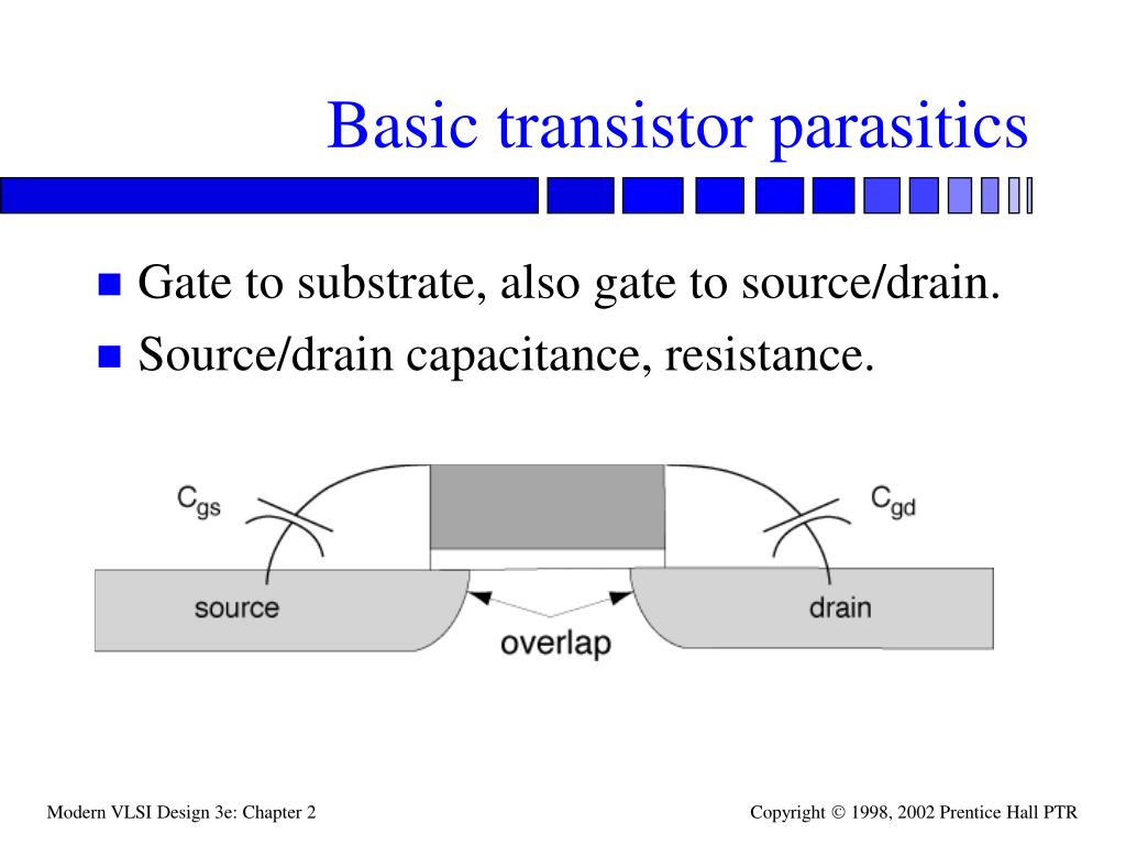 Basic transistor parasitics • Gate to substrate, also gate to source/drain. • Source/drain capacitance, resistance.