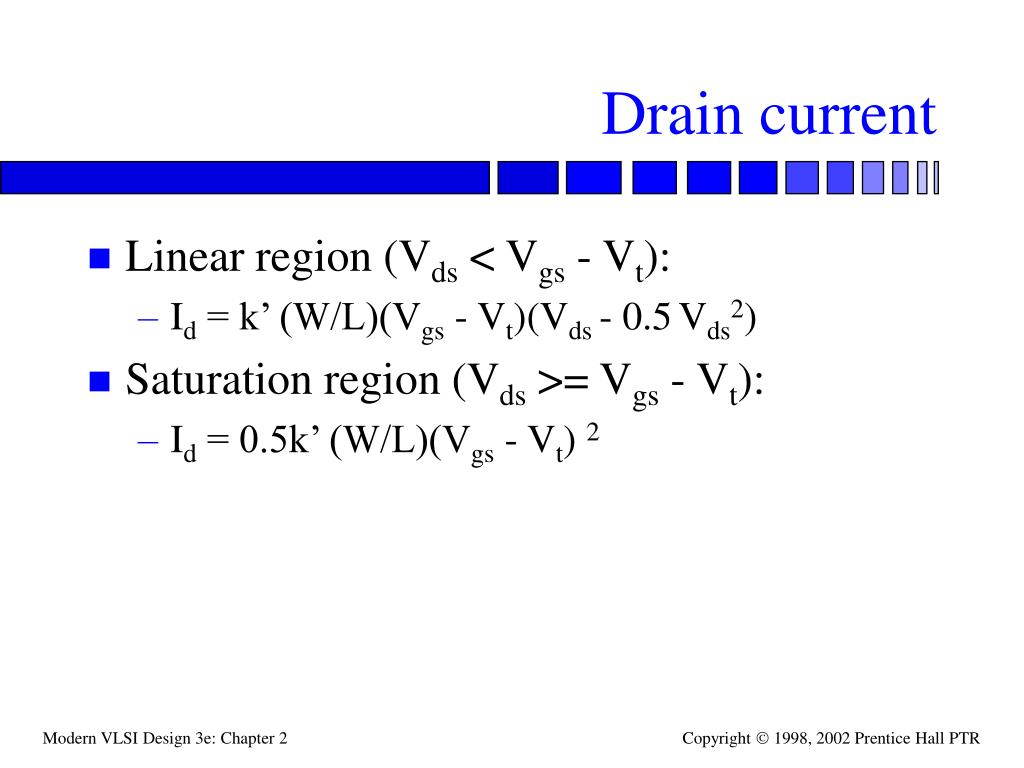 Drain current • Linear region (Vds < Vgs - Vt): • Id = k’ (W/L)(Vgs - Vt)(Vds - 0.5Vds2) • Saturation region (Vds >= Vgs - Vt): • Id = 0.5k’ (W/L)(Vgs - Vt) 2